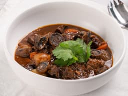 Beef chuck, Pickling onions, Beef stock, Red wine, Mushrooms, Onion, Speck, Carrot, Unsalted butter (Milk), Tomato Paste, Flour (Wheat), Thyme, Garlic peeled, Salt, Black pepper, Bay leaves
