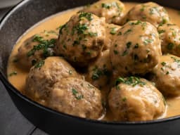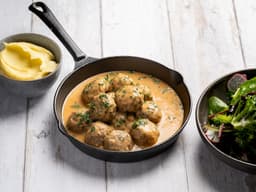 A true comfort classic — tender beef and pork meatballs simmered in a rich, velvety cream sauce with a hint of allspice and nutmeg. We make ours the traditional way, using real stock and a slow reduction to build deep flavor and a silky texture. Perfect served with buttery mash, a spoonful of cranberry relish, and a few greens for a wholesome, satisfying meal.