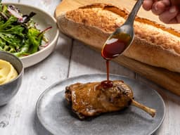 Defrost in fridge overnight, Remove legs from vac bag, place on lined oven tray, Heat in a 180°C oven for approx. 30 minutes or until the legs are crisp and golden. Warm sauce gently in the microwave or in a small saucepan on the stovetop.