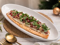 Whole Char-grilled Salmon fillet served with Babaganoush, grape, parsley and walnut salsa Feeds 8-10