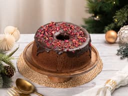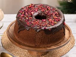 Super light and airy Chocolate chiffon cake, covered in chocolate ganache, garnished with rose petals, freeze dried raspberries, a dessert that will wow your guests and make your Christmas table look the part! (serves 8-10)