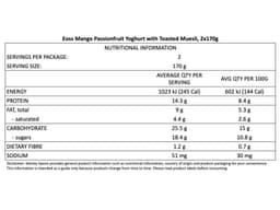 Honey Spiced Muesli (Wholegrain Oats, Honey, Organic Coconut, Sultanas, Pumpkin Seed Kernels, Walnuts, Almonds, Sunflower Kernels, Sunflower Oil, Spice), Eoss Mango Passionfruit Yoghurt [Skim Milk, Milk Solids, Cream, Sugar, Pectin, Live Cultures (including L acidophilis, L. paracasei, Bifidobacterium)], Mango & Passionfruit Preparation (Mango, Passionfruit, Sugar, Water, Pectin, Lemon Juice concentrate, Milk Minerals, Natural Flavours)