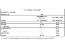 Brown Rice Syrup, Vegetable Glycerine, Fava Bean Protein, Natural Flavour, Vitamin E, Sea Salt, Coconut, Almond, Cashew, Dark Chocolate (Cocoa Solids, Sugar, Milk Fat, Vegetable Fat, Soy (322), Natural Flavour), Gluten-Free Chocolate Crumb (Sodium Bicarbonate), Tapioca Fibre, Grape Juice Concentrate