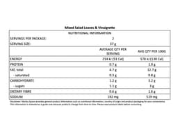 Mixed Leaves (Mix of 4 leaf varieties selected from Coral, Mizuna, Baby Chard, Baby Spinach, Tatsoi), French Vinaigrette [Canola Oil, White Vinegar, Sugar, Salt, Mustard, Onion Powder, Herbs & Spices, Vegetable Gum (Xanthan), Red Capsicum, Garlic, Natural Antioxidants (Mixed Tocopherols), Water]