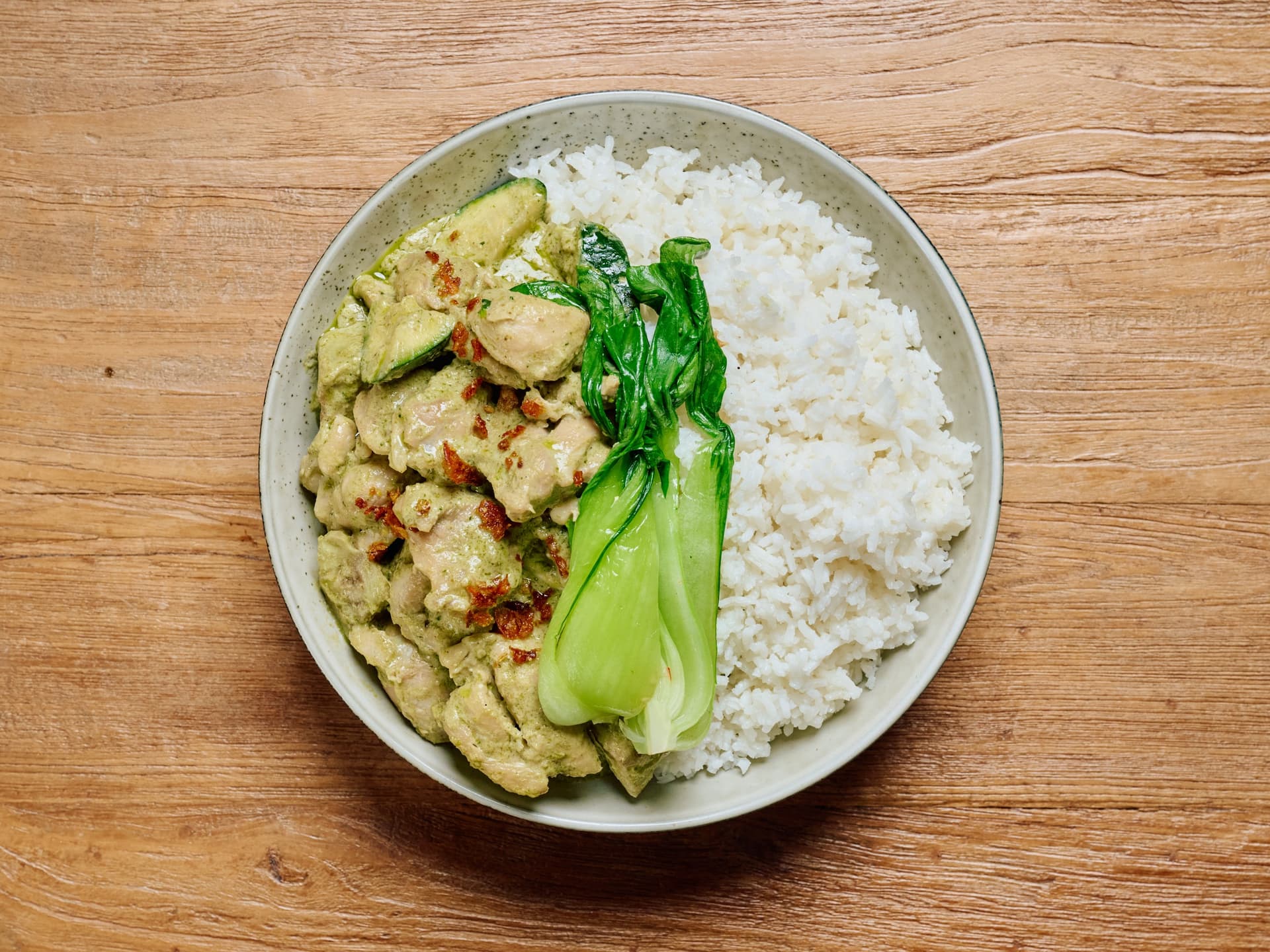 Our authentic Thai Green Chicken Curry features tender, juicy chicken pieces simmered in a rich, creamy coconut milk sauce. The curry paste is aromatic and perfectly balanced, with bright notes of lemongrass, galangal, and fresh chili that give it its signature fresh warmth. This flavorful curry is served alongside fluffy white rice and nutritious, crisp slices of Bok Choy, making it a complete and well-rounded meal