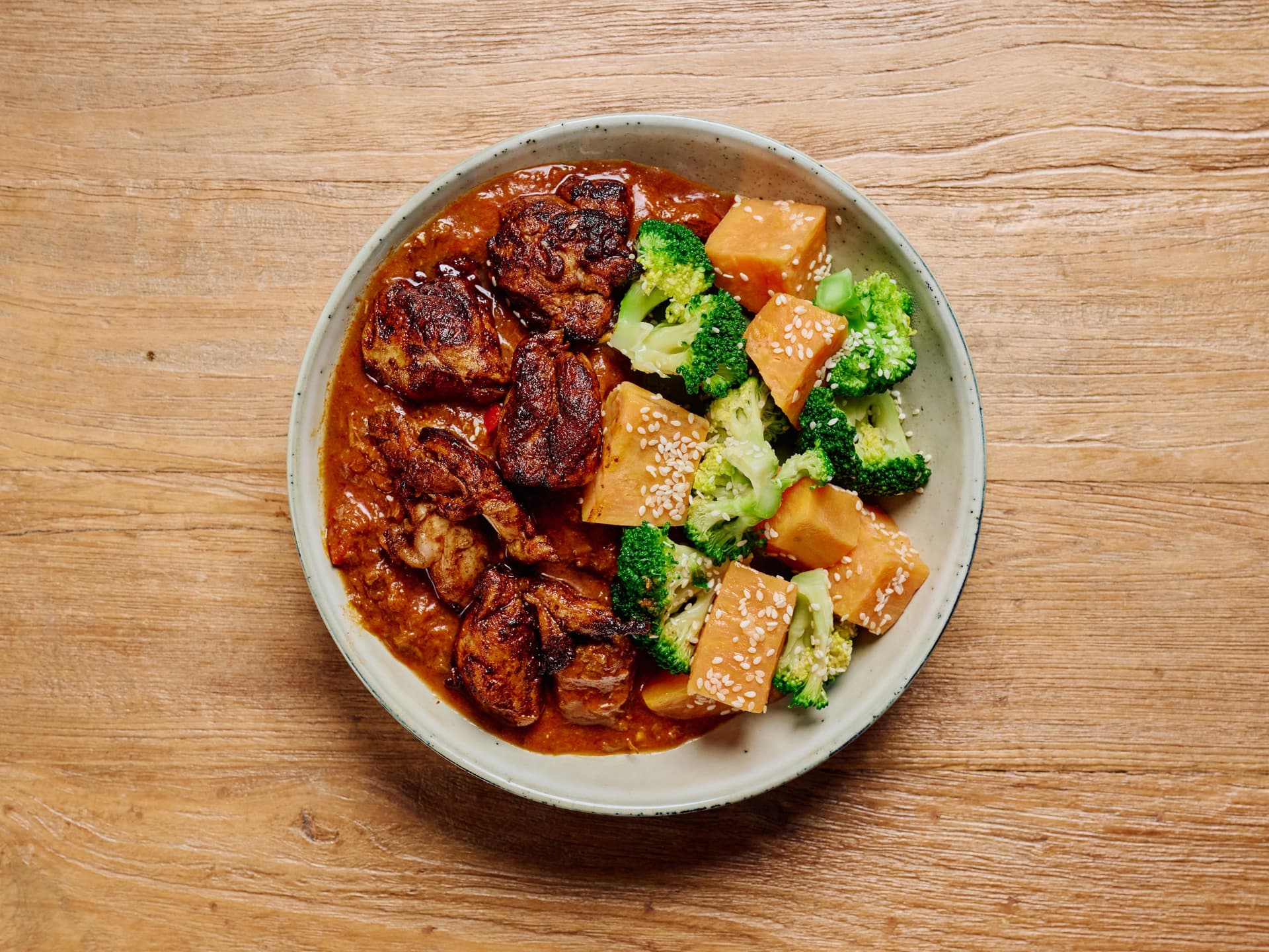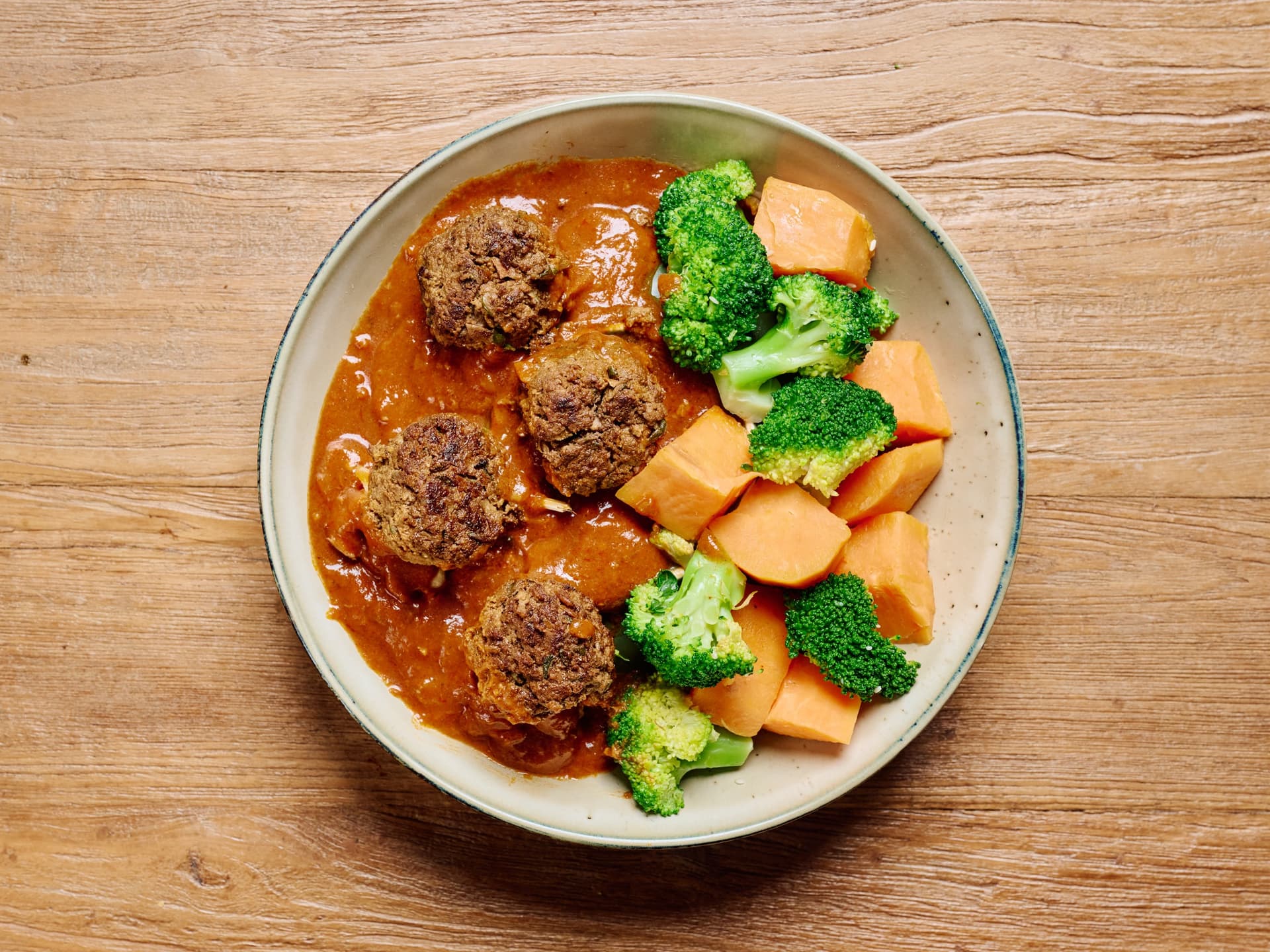 Our rich Moroccan Beef Meatballs are hand rolled from premium beef and seasoned with a balanced blend of aromatic spices like turmeric, cumin and coriander, then simmered in a savory tomato sauce. The meatballs are perfectly paired with tender, naturally sweet chunks of roasted sweet potato and healthy, vibrant broccoli florets