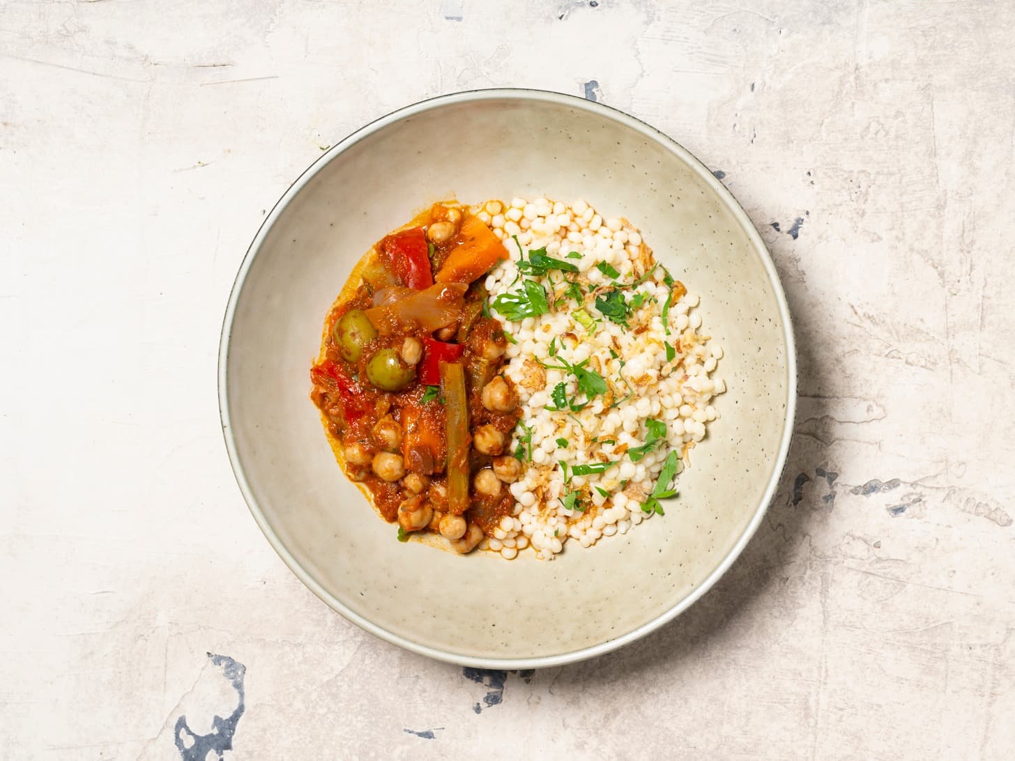 A plant based favourite, our vegetable tagine is packed full of sweet potato, chickpeas, zucchini, slow-simmered in a beautiful blend of spices and tangy olives. Served with fluffy Pearl Couscous, this dish is a complete, satisfying, and naturally vegan meal that’s ready in minutes. It's the perfect easy way to enjoy authentic North African cuisine!