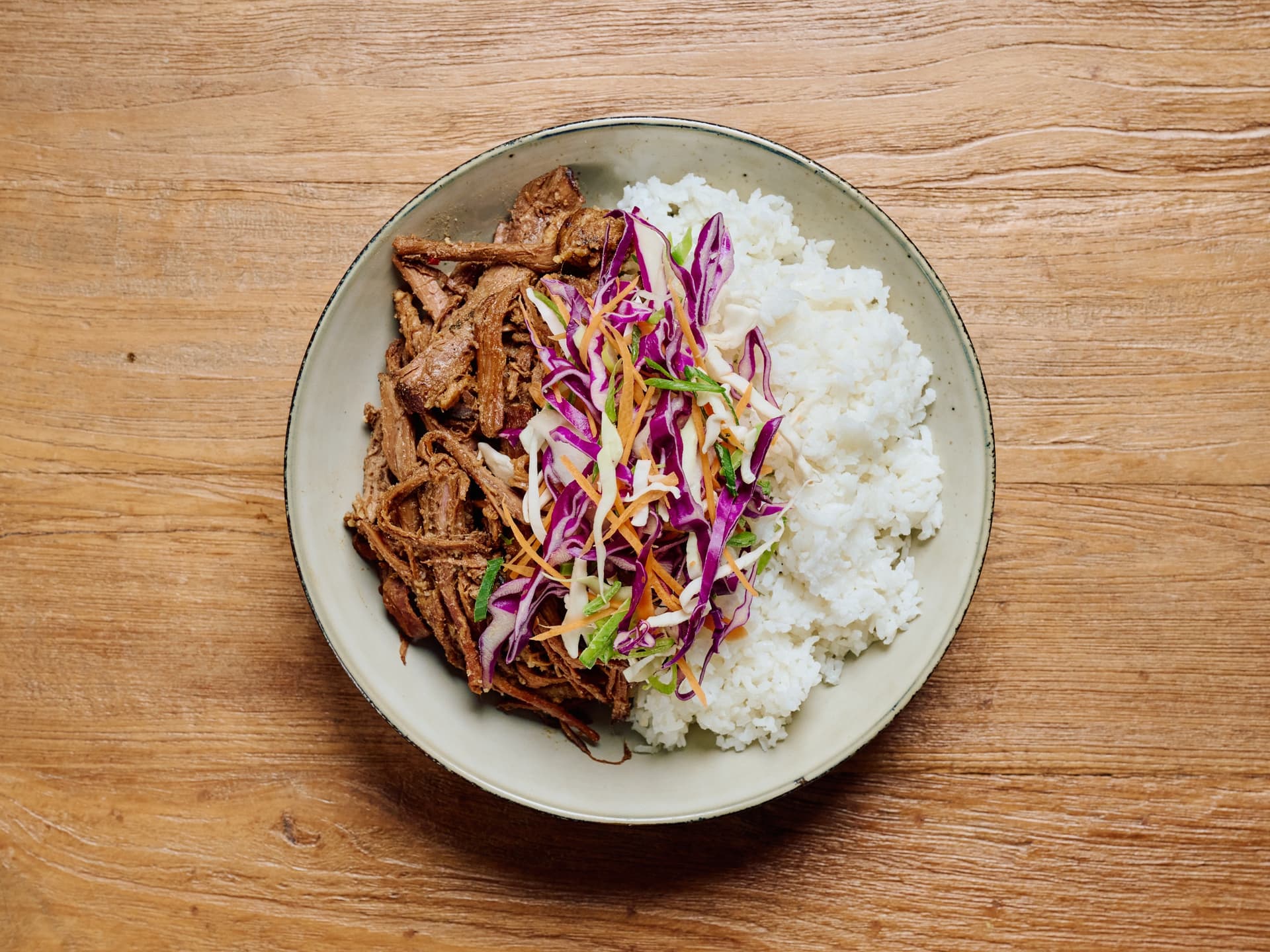 Our tender Beef Brisket is slow-simmered in a rich, classic glaze featuring balanced notes of soy sauce, fresh ginger, and star anise. The beef is succulent, flavorful, and melts in your mouth. This high protein brisket is served over fluffy white rice and complemented by a bright, crunchy Asian Slaw, a refreshing mix of shredded vegetables.