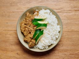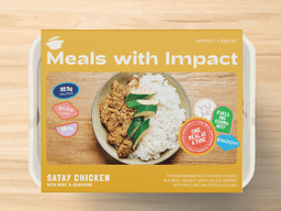 Satay Chicken [Chicken thighs, Coconut milk, Chicken stock (GF), Peanuts, Kecap Mani (Wheat, Soy, Sulphites), Dark Soy Sauce (Wheat), Lime juice, Vegetable oil, Unsalted peanut butter, Onion (brown), Garlic mince, Fish sauce (V) (Soy), Chilli red, Kaffir lime leaves], Basmati rice, Satay Chicken Seasoning [Curry powder, Onion powder, Sugar, Coriander powder, Cumin, Turmeric powder, Paprika, Salt, Chilli powder], Zucchini