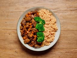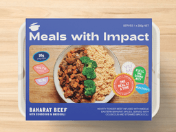 Our rich, tender Baharat Beef features slow-cooked beef mince seasoned generously with Baharat spice, a signature blend of cumin, coriander powder, cinnamon, nutmeg and cardamom that delivers deep, savory warmth. The fragrant beef is served over fluffy, light couscous and paired with vibrant, crisp broccoli florets for a complete, well balanced meal.