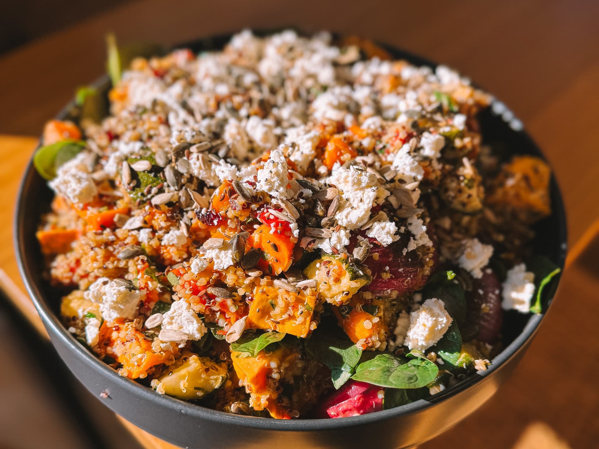 Roast chicken breast sliced, served with seasonal roast veg, feta and drizzled with Maple Dijon Dressing - Topped with feta and seeds (similar salad pictured).