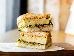 Our seasonal plant based sandwich. This month's sandwich is "Chick Peace and Love" - Sicilian chickpea panelle with muhammara, roasted zucchini and rocket on fresh baked foccacia.
