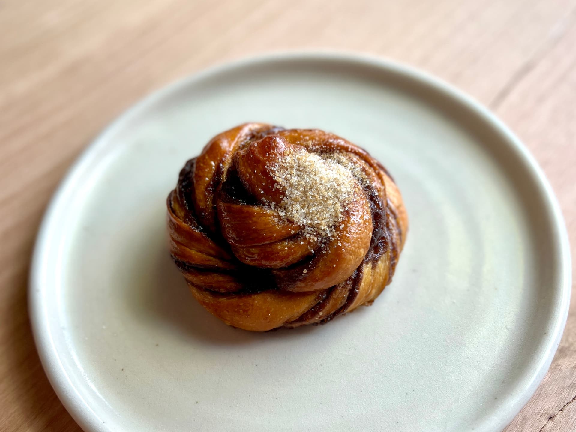Our signature spent coffee & toasted koji bun. Developed to utilise spent coffee grounds from our espresso offering, we mill the grounds with honey, unrefined sugar, butter and organic sunflower oil before finally folding with dark-roasted barley koji. The butter is spread liberally between sheets of our shokupan dough and rolled up. Baked to retain softness and brushed with an espresso syrup to finish.