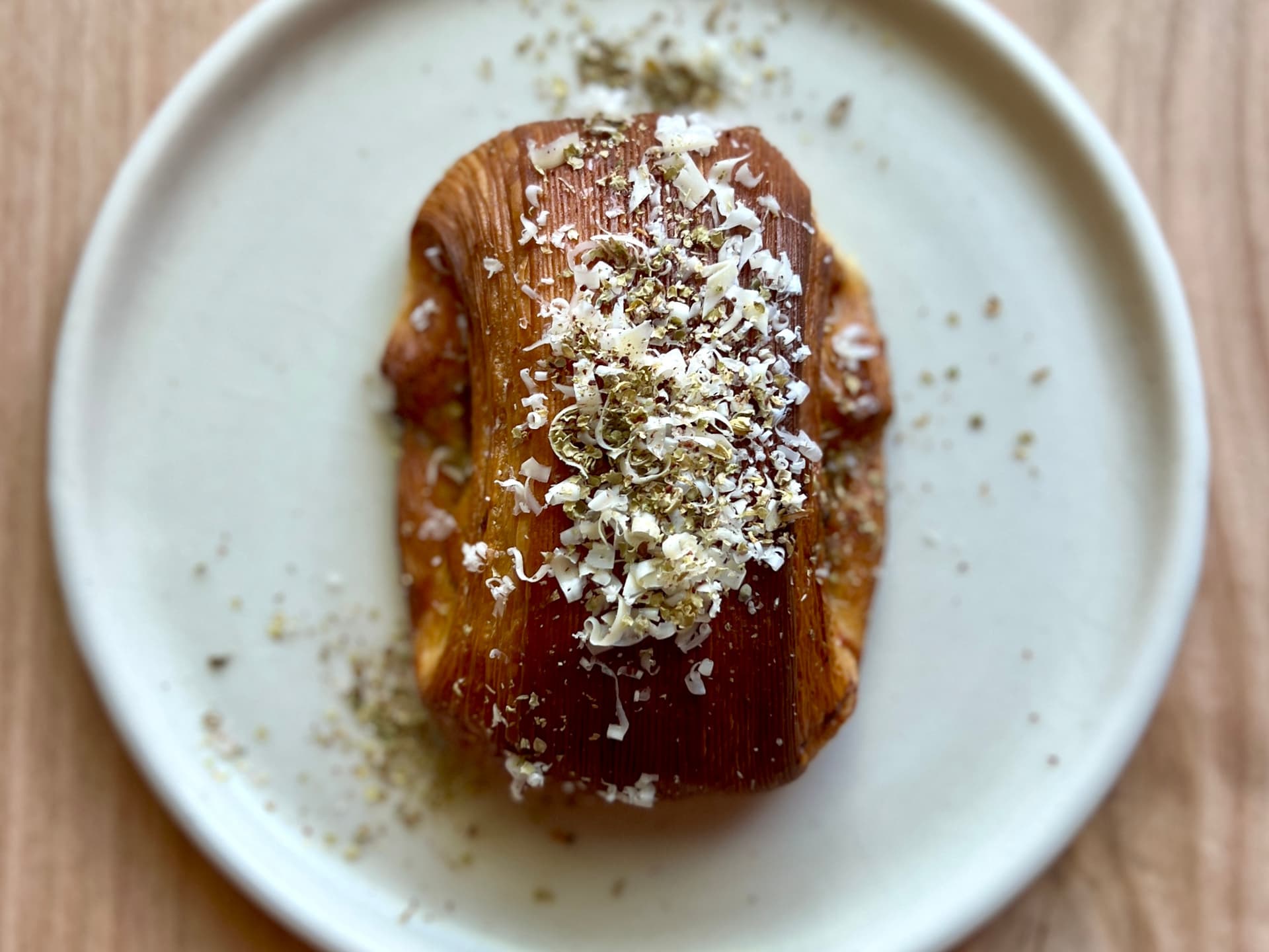 Potatoes tossed in a seasoned reduced cream, layered with marjoram-heavy za'atar and sharp mahon de menorca cheese, wrapped in crisp croissant pastry.