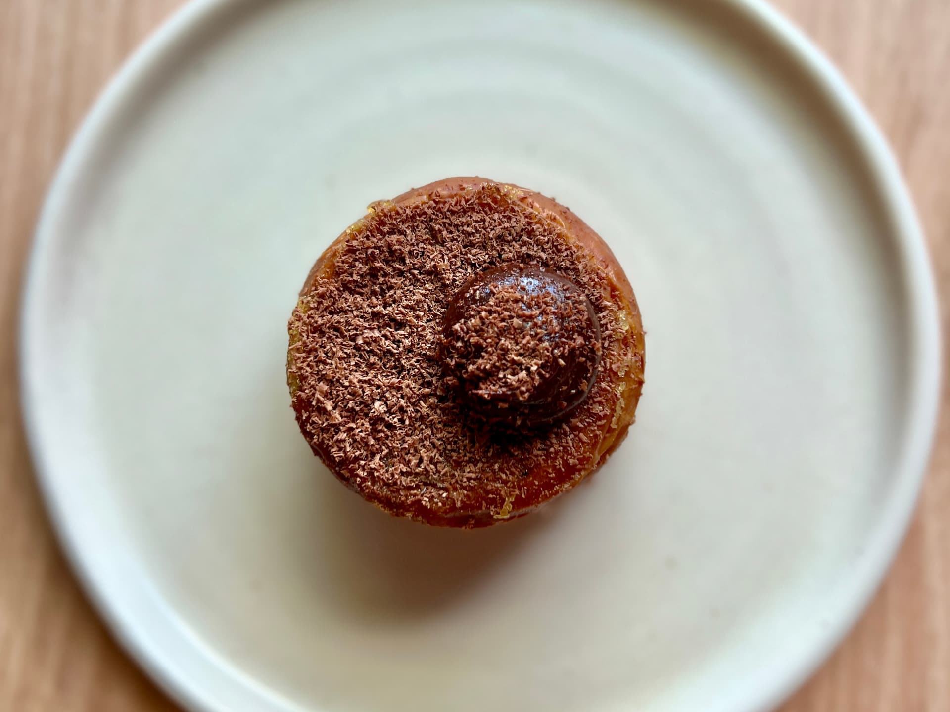 Croissant pastry caramelised on the outside, filled with a light almond frangipane and dark chocolate ganache. Finished with a rich caramel ganache and dusted with grated Dominican chocolate Contains nuts.