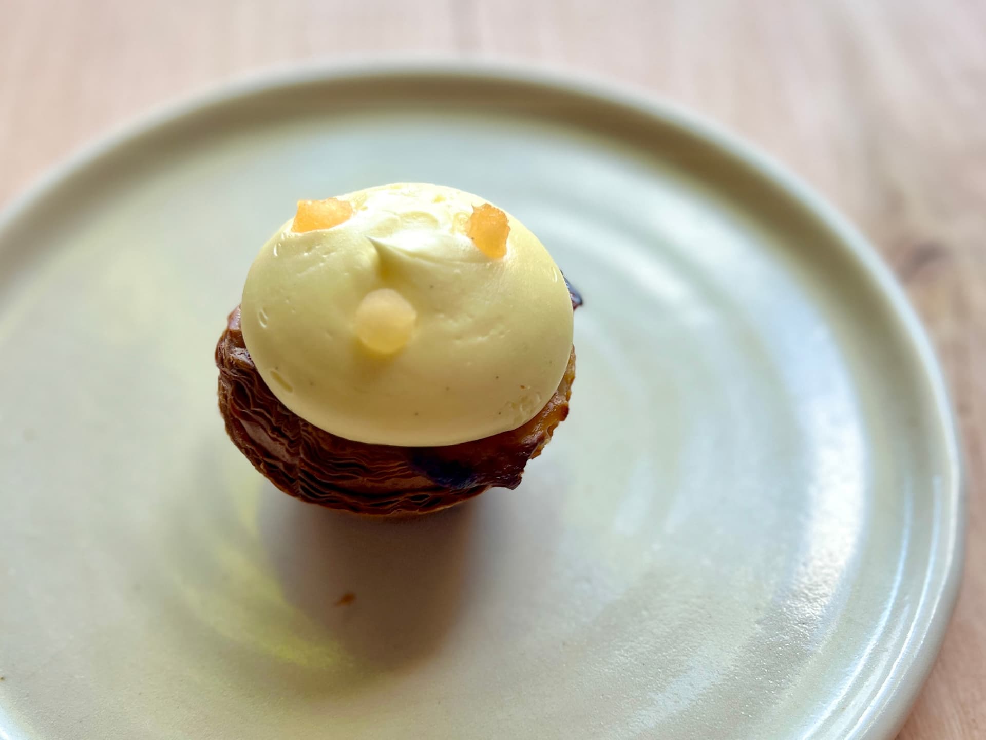 A crisp croissant tart shell filled with flan custard made with surplus stone-fruit shrub from our mince pie filling, finished with whipped vanilla bean mascarpone ganache and orange sugar melon grown in Queensland. Contains gelatine