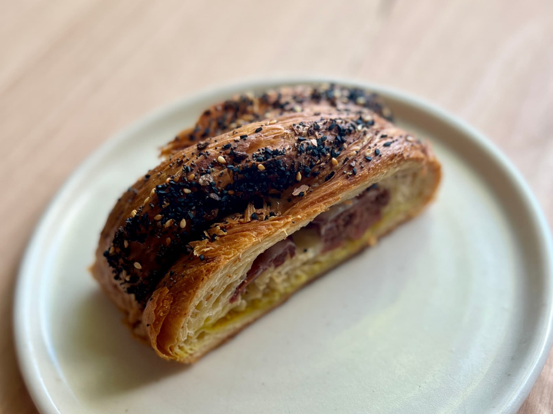 An homage to London's Beigel Bake, our croissant dough is filled with braised salt beef, sharp kraut, fontina cheese and a hit of hot mustard before being coated in everything seasoning. Contains sesame