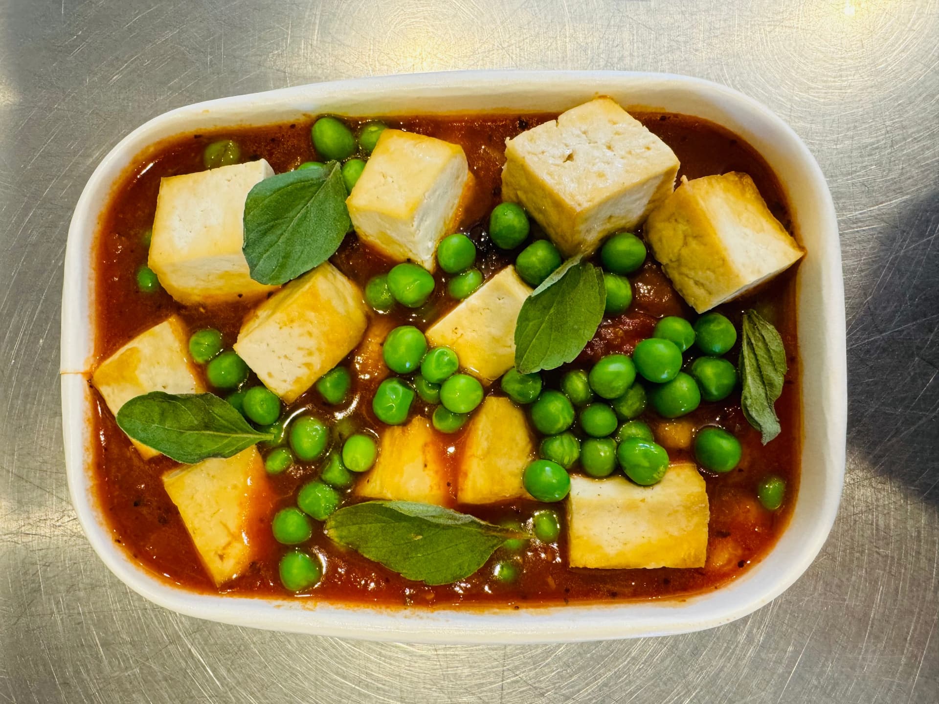 Crisp roasted tofu, served on top of a hearty chickpea, olive and mushroom stew, garnished with spring peas.