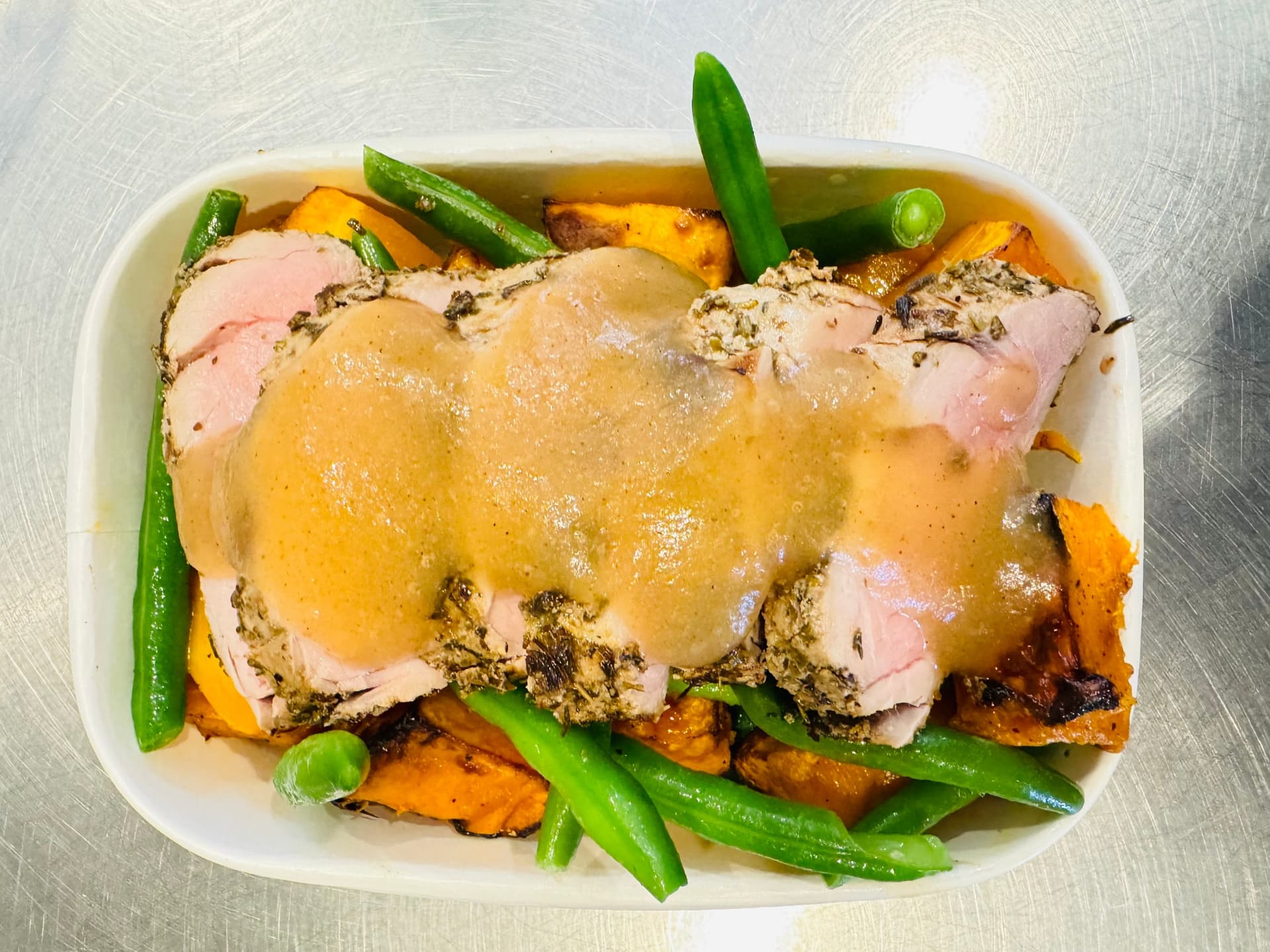 Tender, sliced pork fillet paired with sweet, caramelised roast pumpkin and crisp green beans, finished with a fragrant spiced apple sauce.