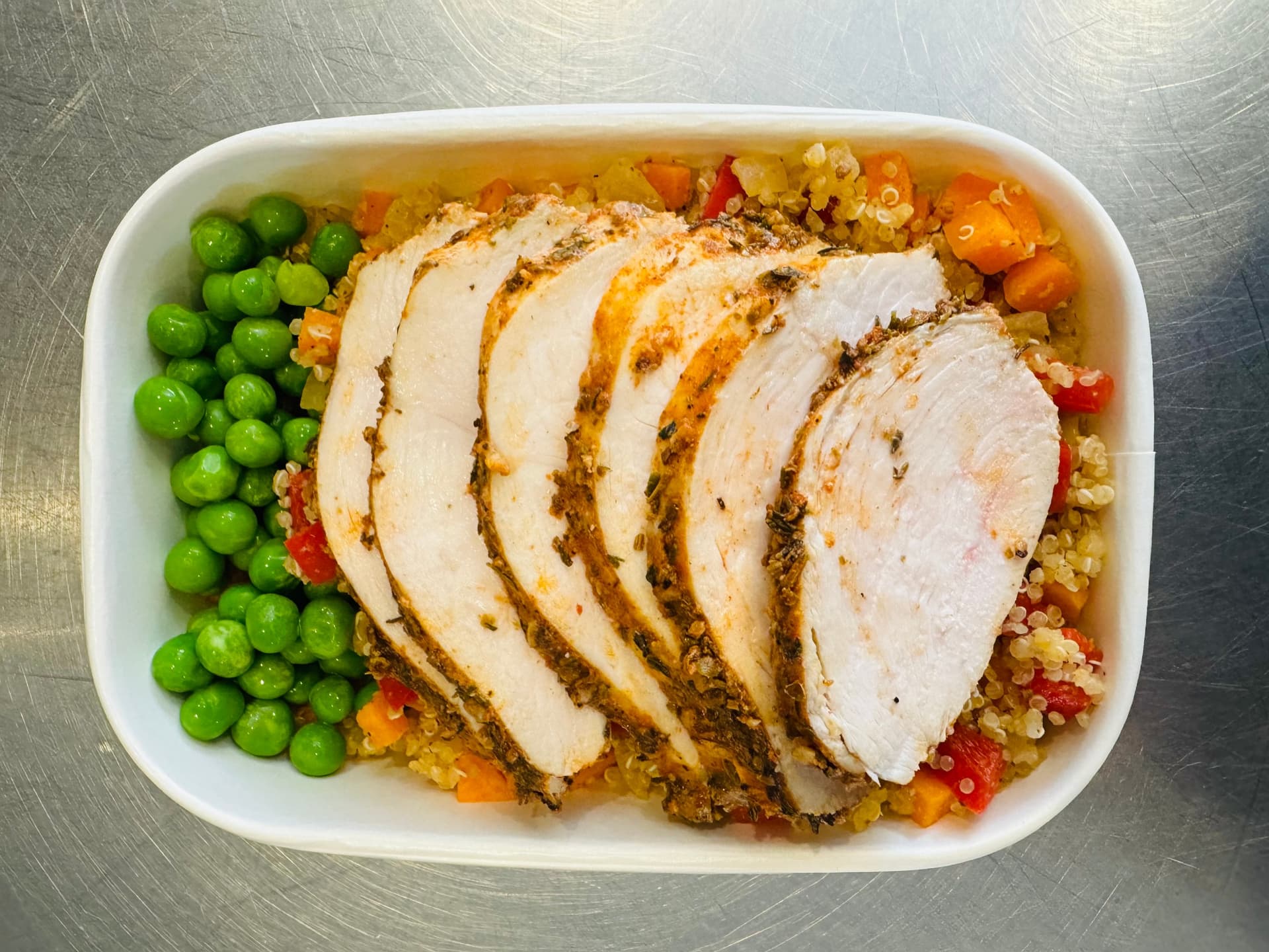 A delicious blend of tender and nicely seasoned chicken breast, fluffy quinoa and sauteed vegetables.