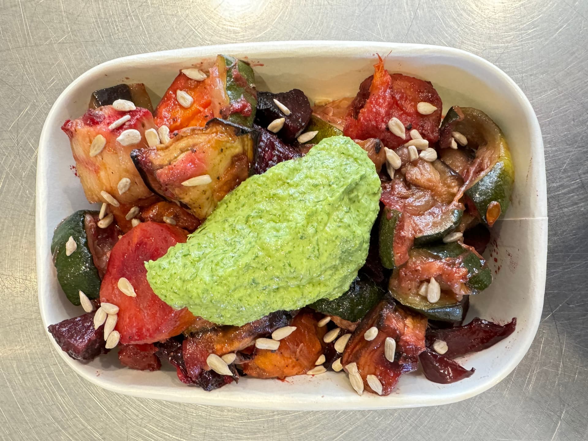 Perfectly roasted seasonal vegetables topped with a creamy, herb-infused tahini sauce and sunflower seeds.