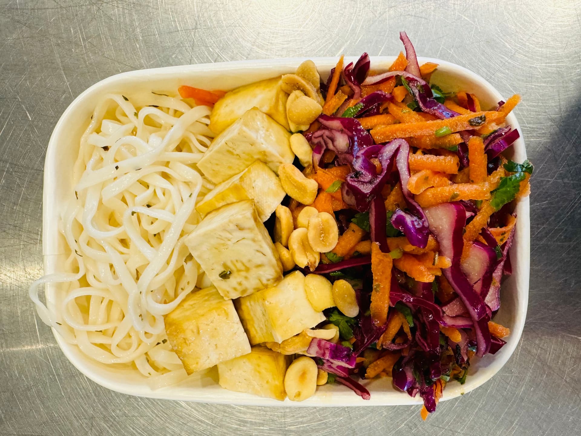 Crisp vegetables and tender tofu tossed with rice noodles in a tangy Vietnamese dressing garnised with peanuts