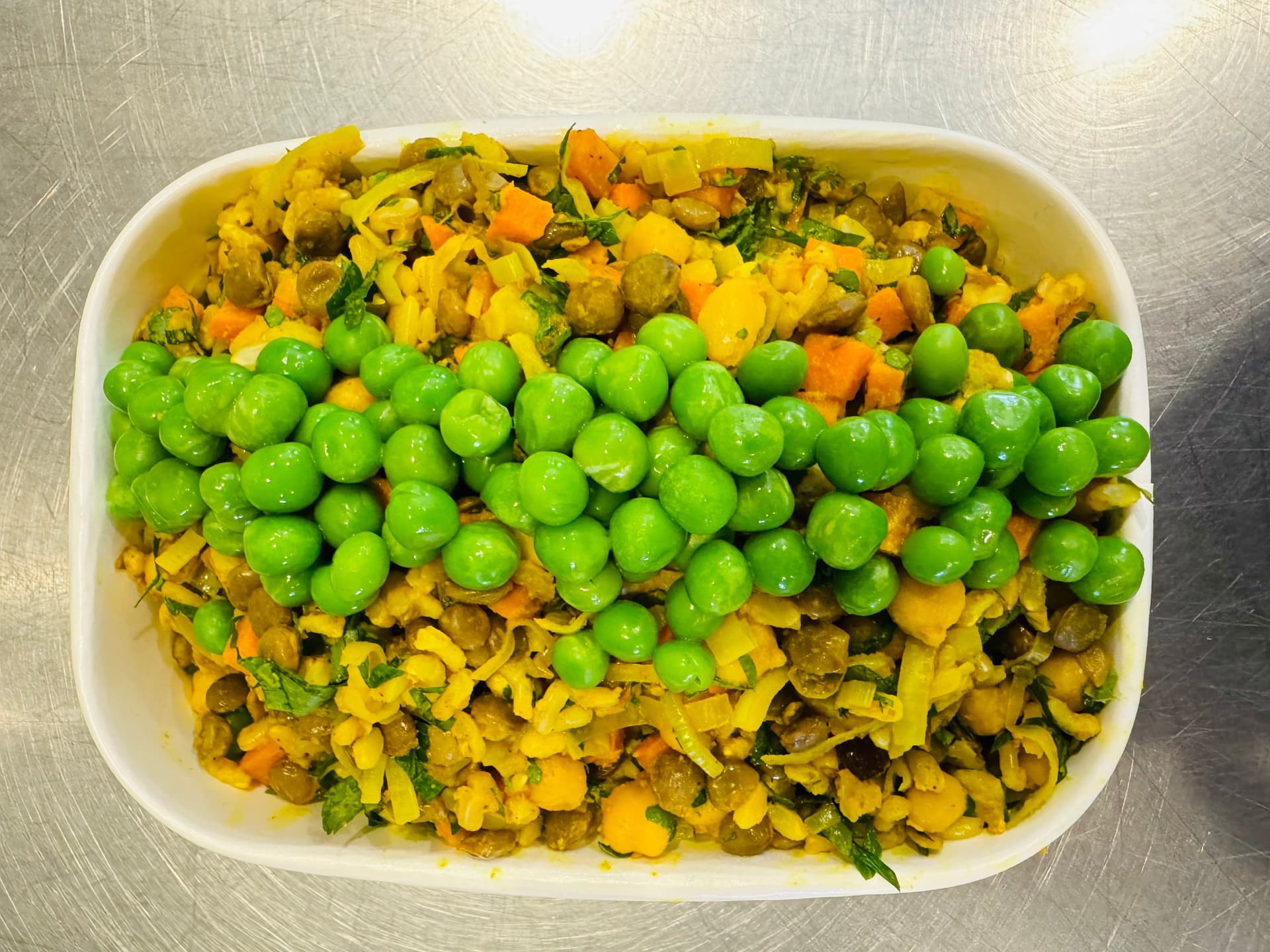 Fluffy brown rice and infused with fragrant turmeric, mixed with tender lentils, chickpeas and sweet leeks.