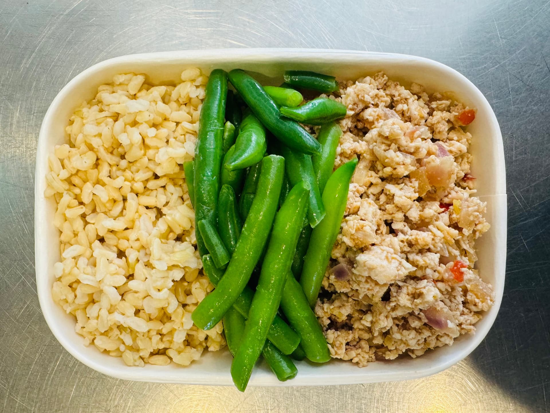 Succulent chicken mince cooked in a blend of aromatic Thai herbs and spices, served alongside fluffy brown rice and crisp green beans.