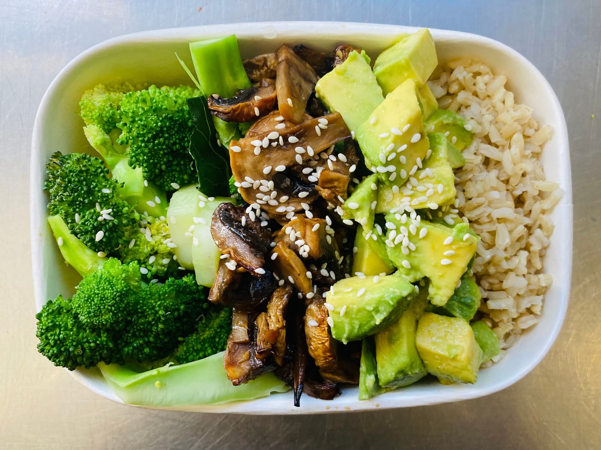 This delicious dish features earthy mushrooms sautéed in a teriyaki sauce, served alongside fluffy brown rice and steamed broccoli, topped with creamy avocado and a sprinkle of sesame seeds.