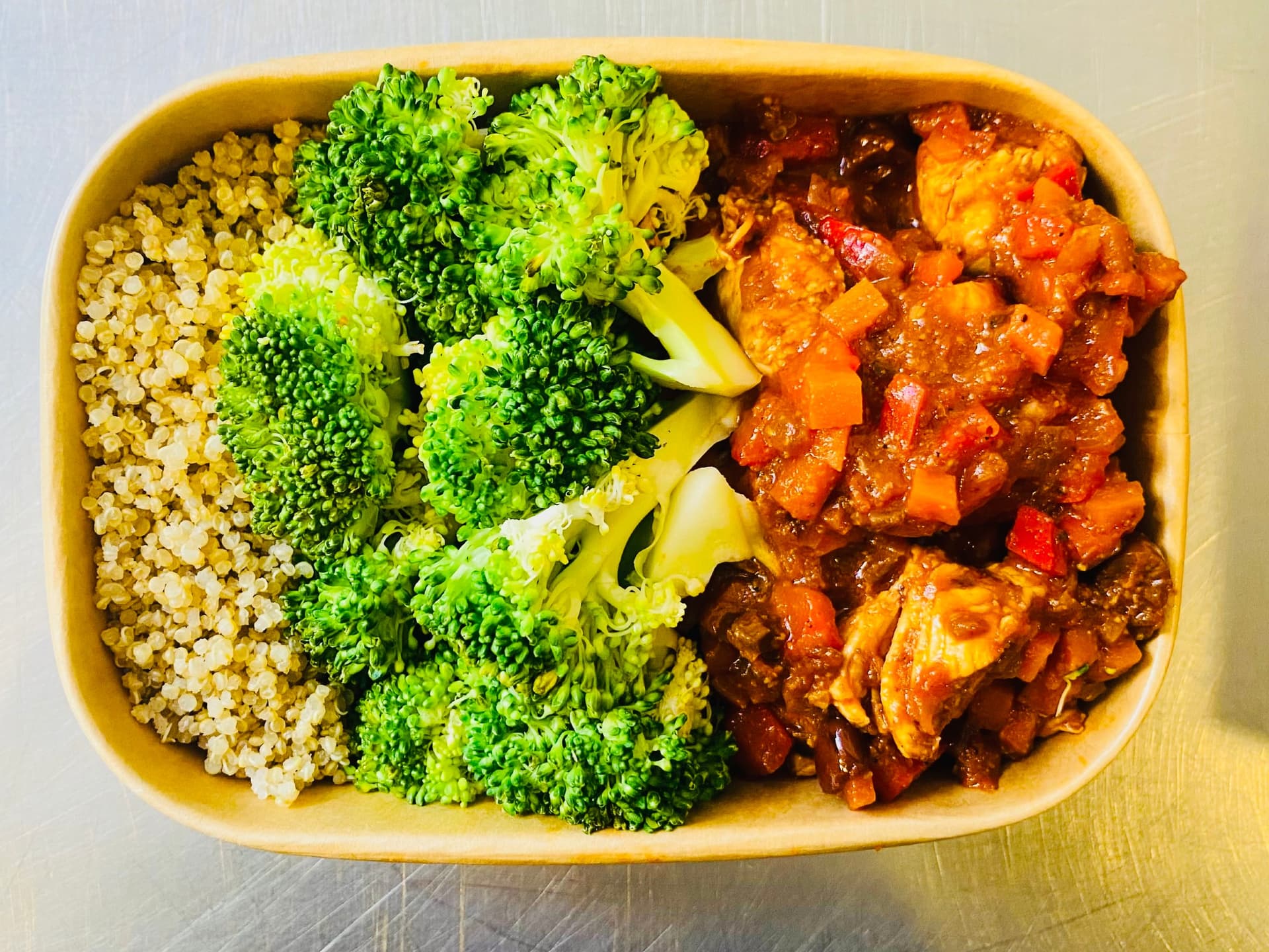 Succulent chicken breast cooked in a rich tomato sauce with red capsicum and black olives, served with a side of fluffy quinoa and steamed broccoli.