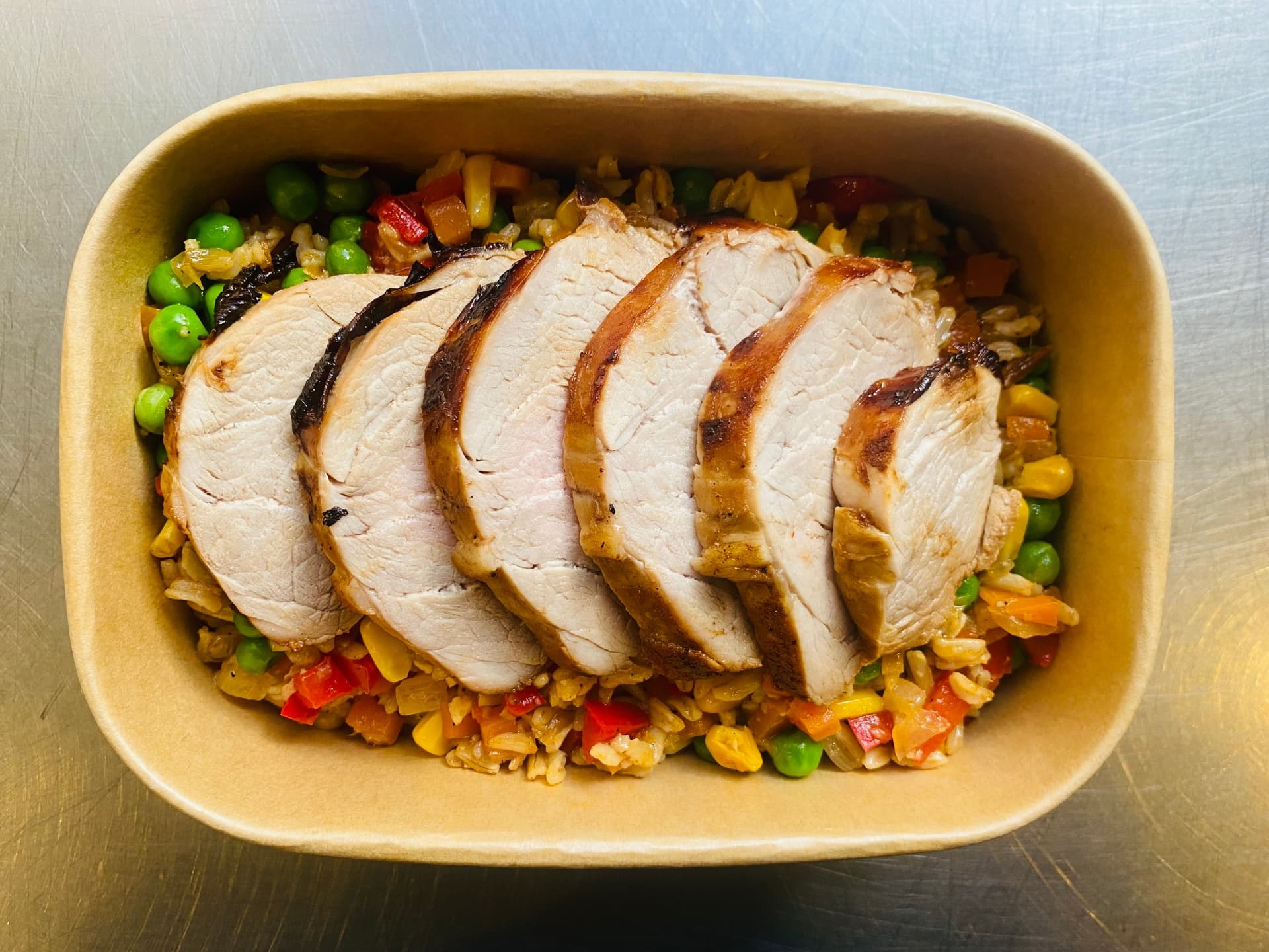 Tender fillet of pork marinated in a rich, savoury glaze served on top of a vibrant mix of stir-fried vegetables and brown rice.