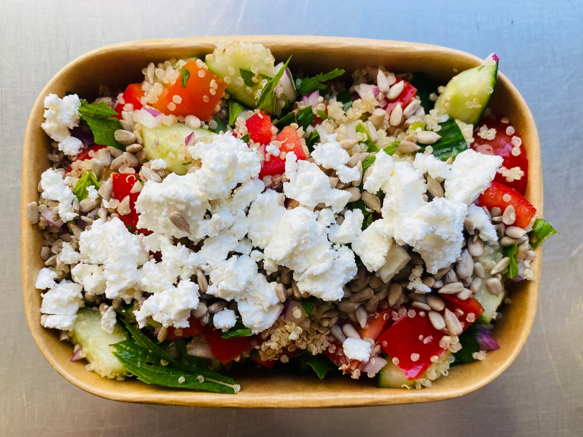 Tinned tuna (Fish), Canned cannellini beans, Tomatoes, Avocado, Red capsicum, Cucumber, Red onion, Dijon Mustard Vinaigrette [Extra virgin olive oil, Lemon juice, Dijon mustard, Himalayan salt, Pepper], Parsley, Sunflower kernels