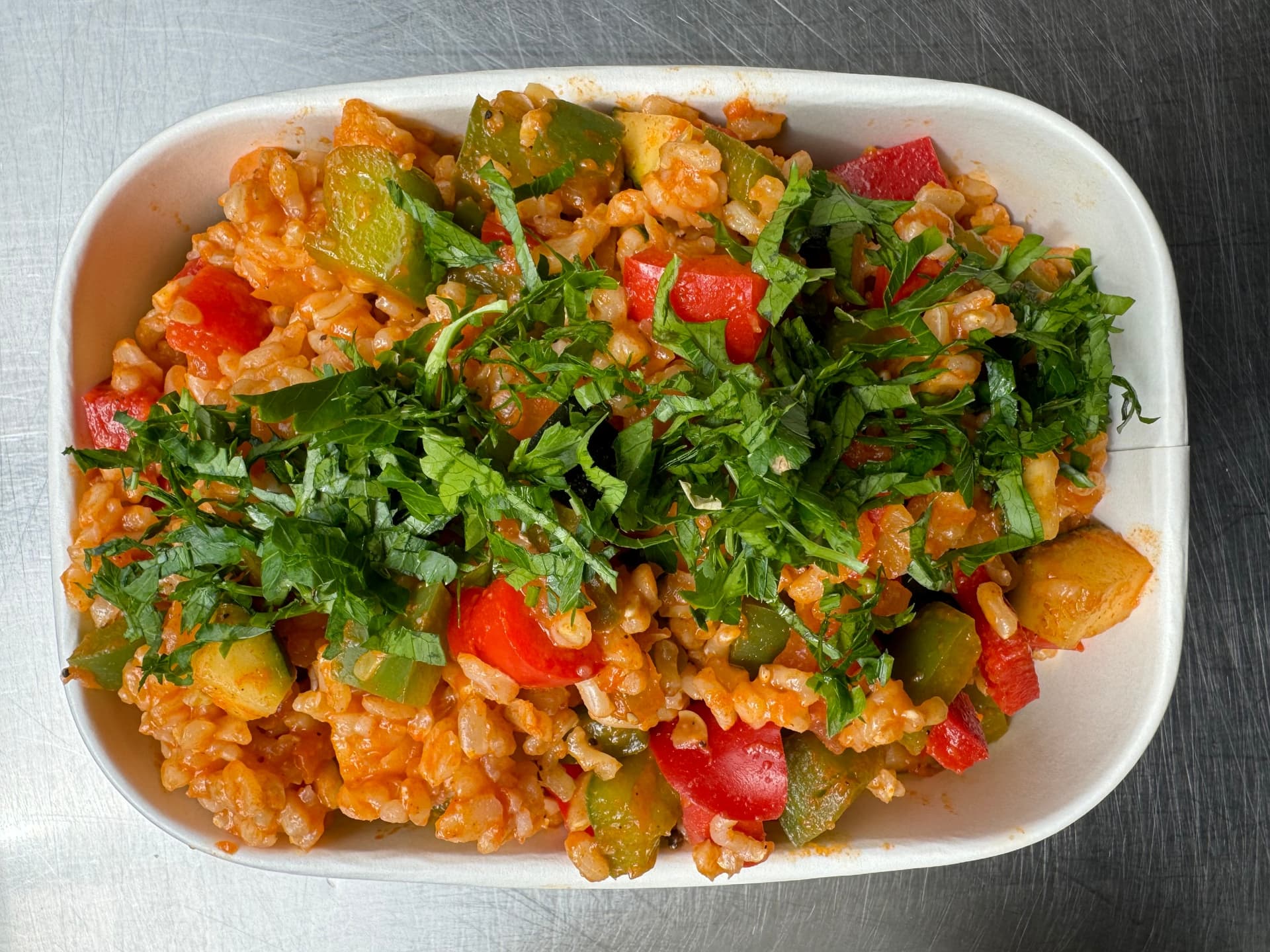 A colourful medley of seasonal vegetables simmered with fragrant brown rice, and a blend of aromatic spices, garnished with green peas.