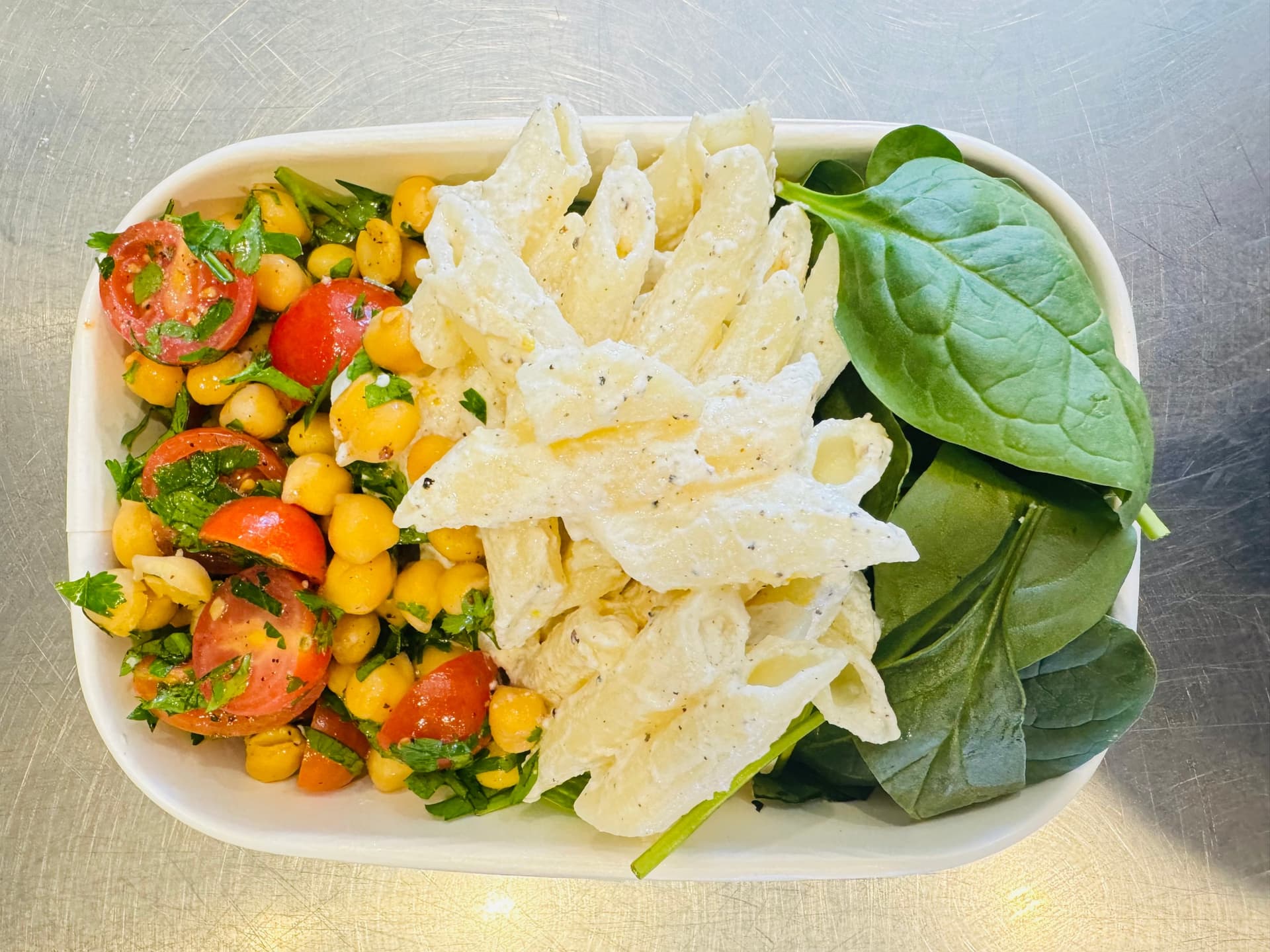 Plump chickpeas and al dente pasta tossed with creamy ricotta and lemon, garnished with fresh tomato and baby spinach with a tangy lemon dressing