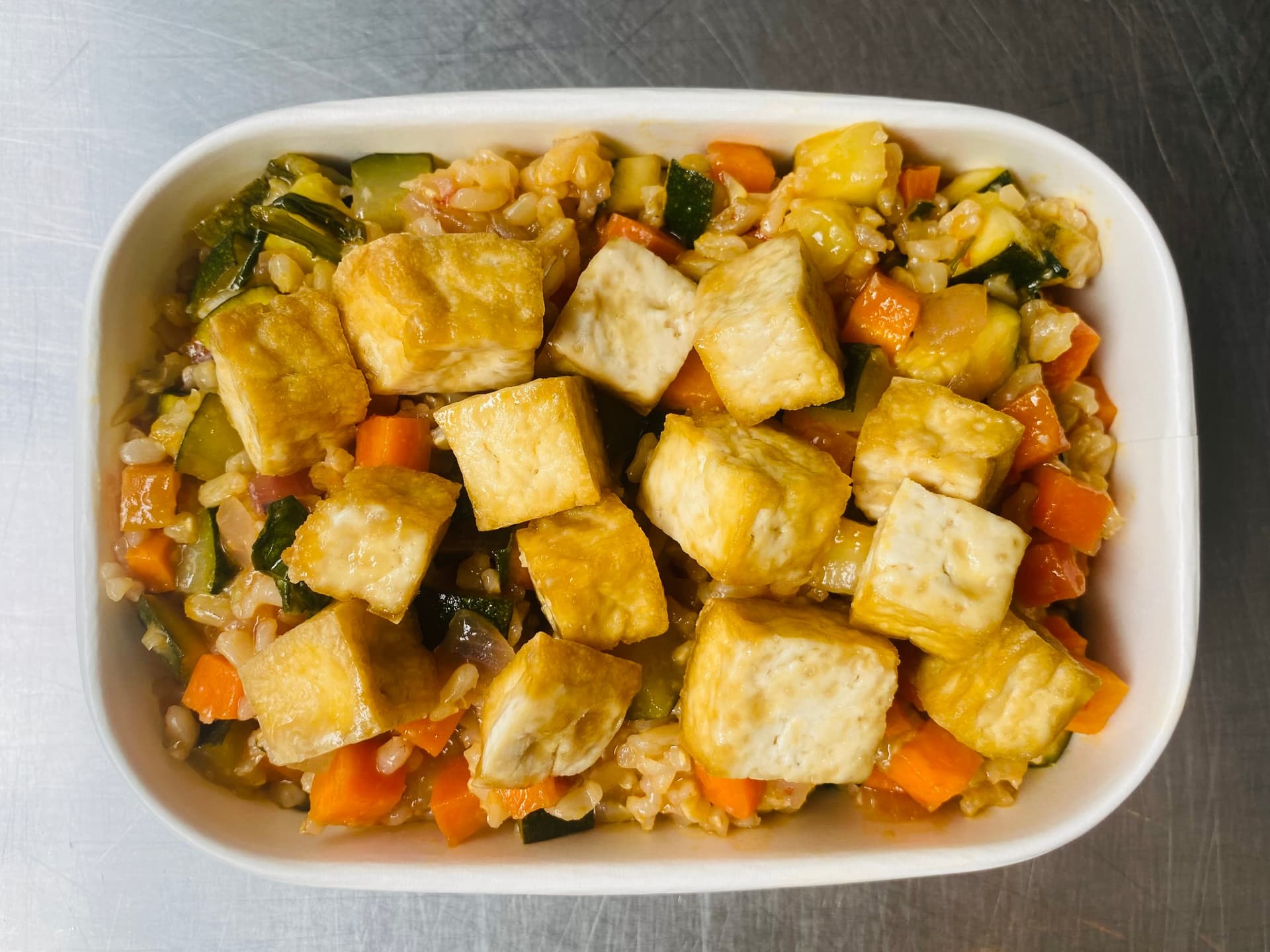 A nourishing dish packed with vegetables, sautéed with brown rice and topped with crispy, golden tofu for an extra boost of protein.