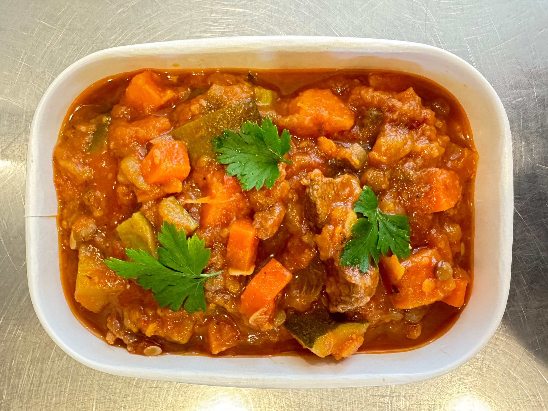Tender beef and hearty vegetables slow-cooked in a rich, smoky lentil sauce with a kick of heat.