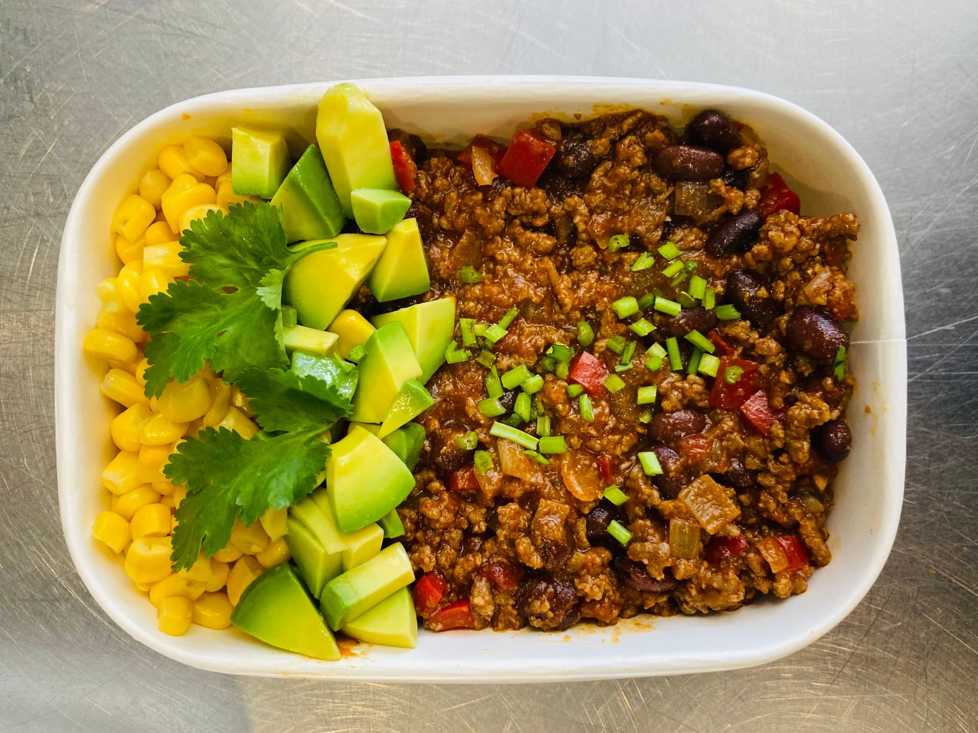 A delicious blend of tender beef and black beans simmered in smoky BBQ sauce, served alongside a refreshing mix of corn, diced tomatoes, and creamy avocado.