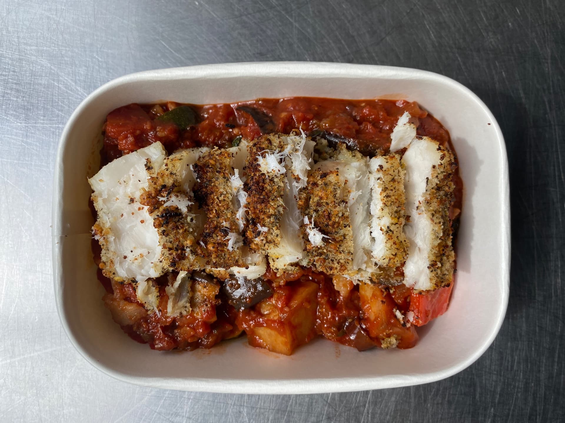 Tender fish fillets baked with juicy tomatoes and zucchini, topped with a savory parmesan crust.