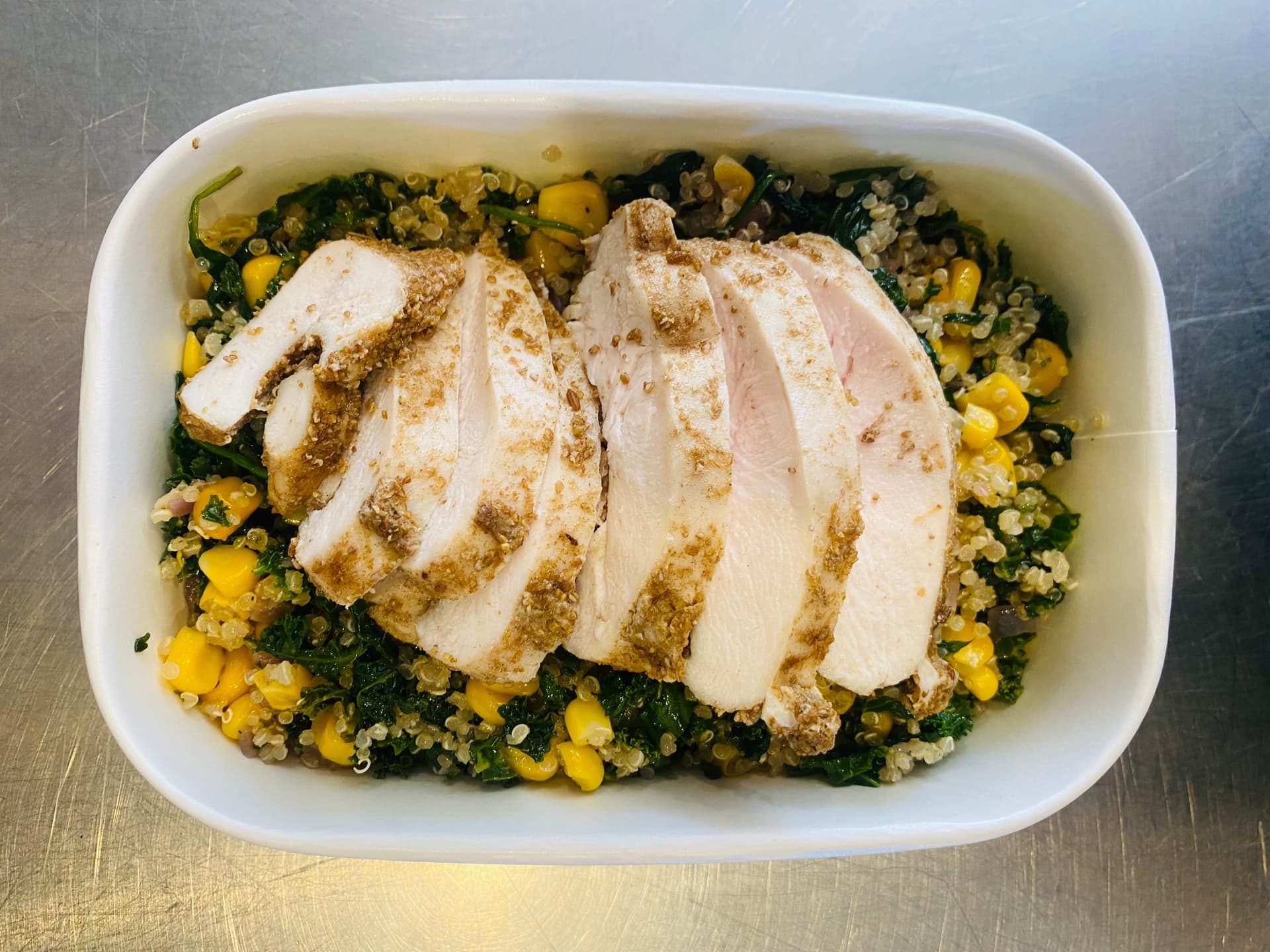 Juicy chicken breast seasoned and steamed with Mexican spices, served over a hearty mix of quinoa, sweet corn, lime and fresh kale and garnished with fresh coriander.