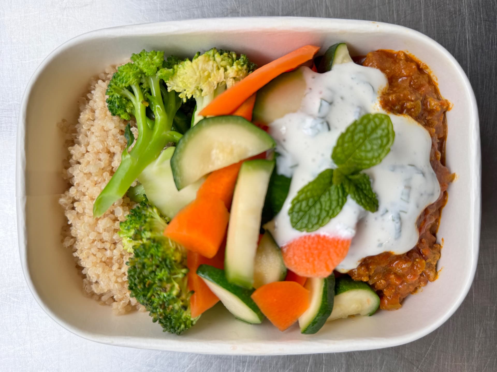 Slow cooked beef mince in a rich, tangy kasundi sauce, served alongside fluffy quinoa and fresh seasonal vegetables, topped with a refreshing mint yoghurt.