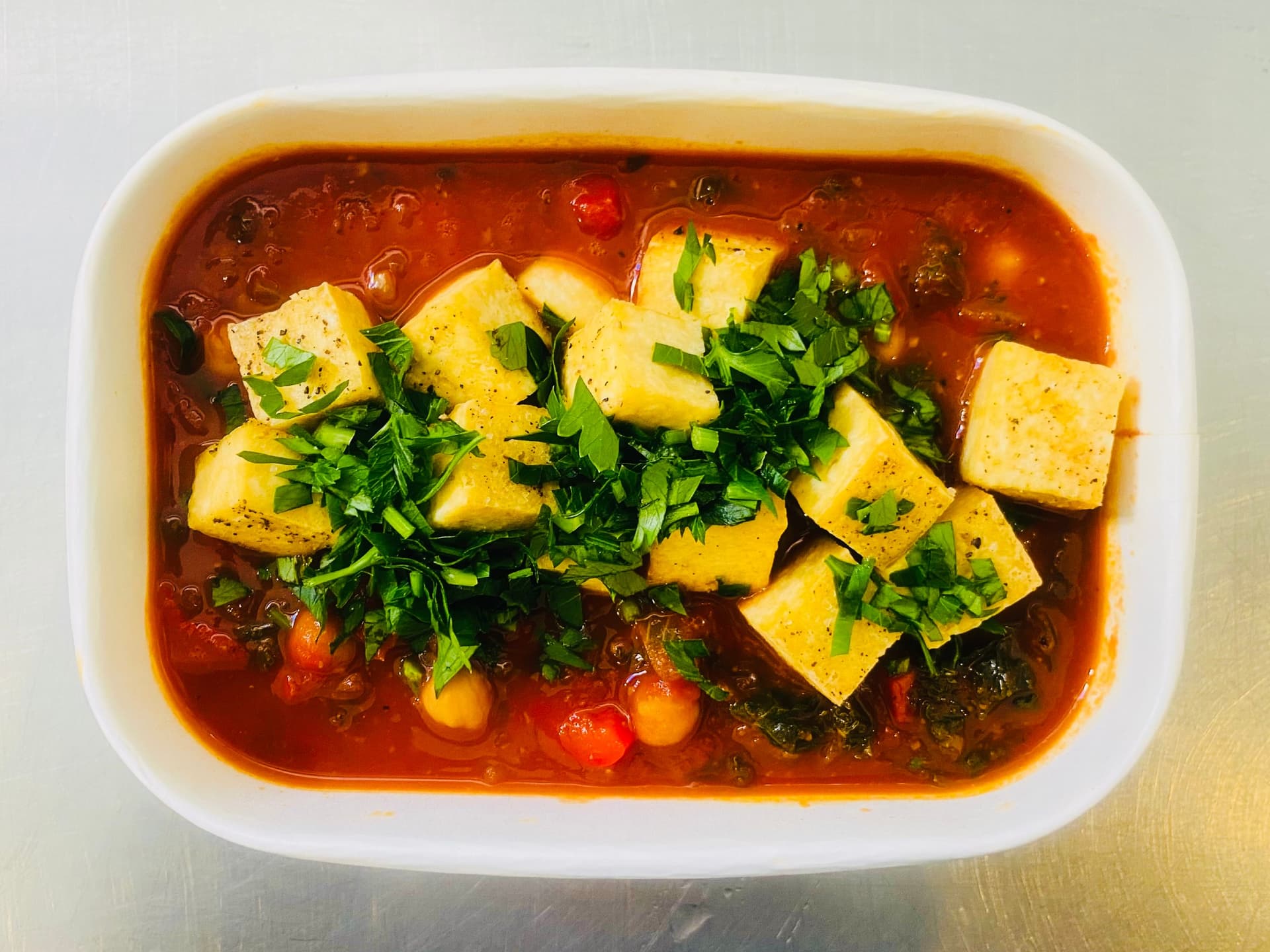 A hearty dish featuring tofu cubes in a rich tomato base with chickpeas and kale, all seasoned with aromatic spices.