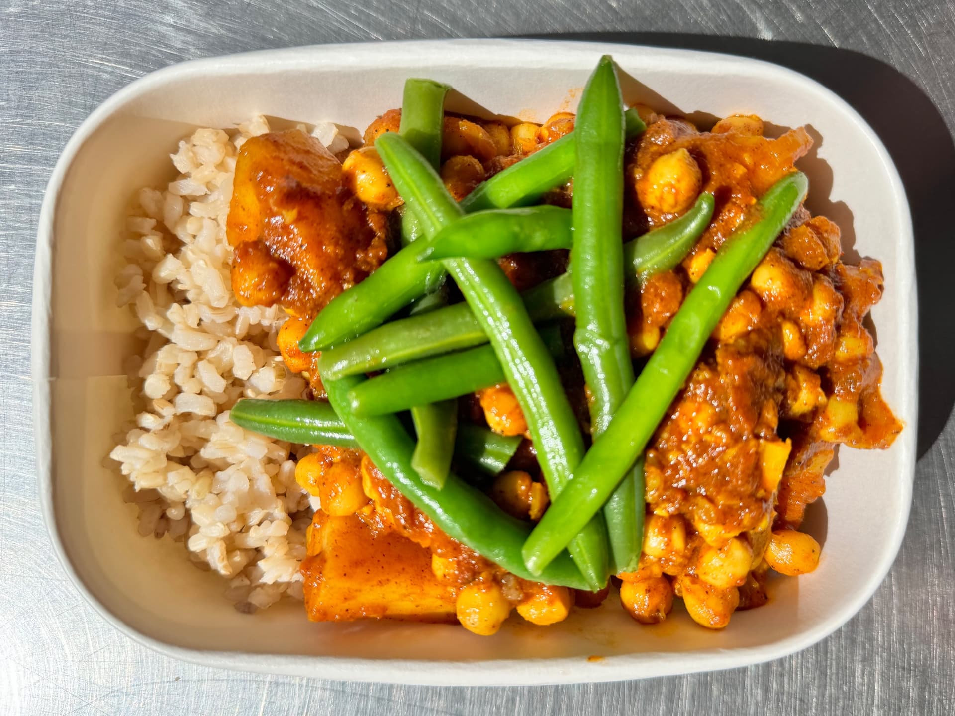 Tender chickpeas simmered in a fragrant blend of tomato and traditional Indian spices, served alongside fluffy brown rice and green beans.