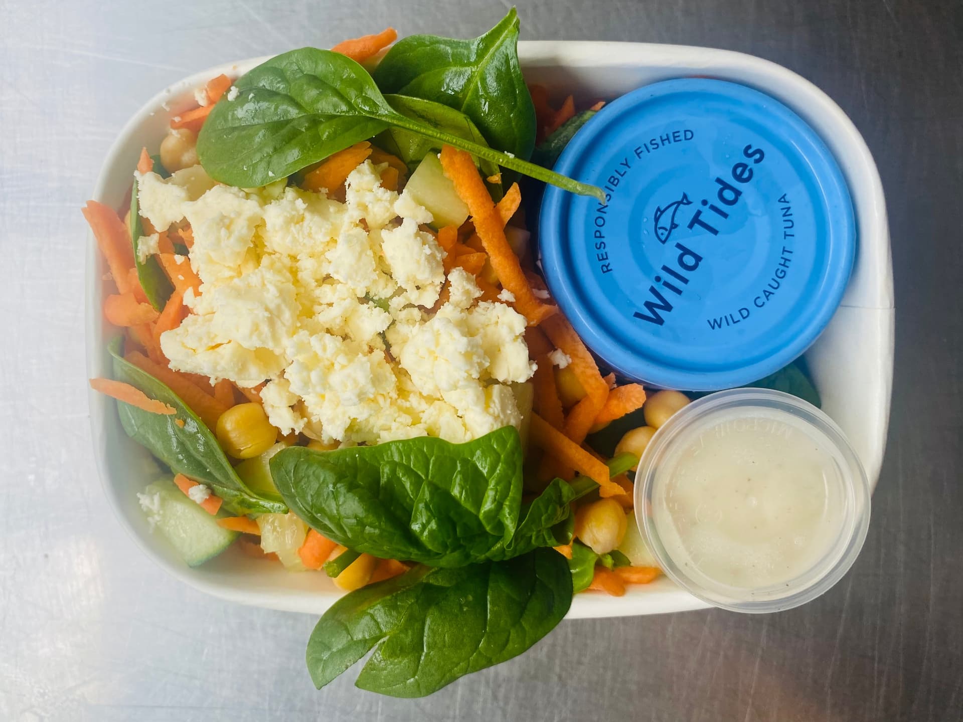 Tuna flakes paired with protein-rich chickpeas, creamy feta, crunchy cucumber and drizzled with a lemon dressing.