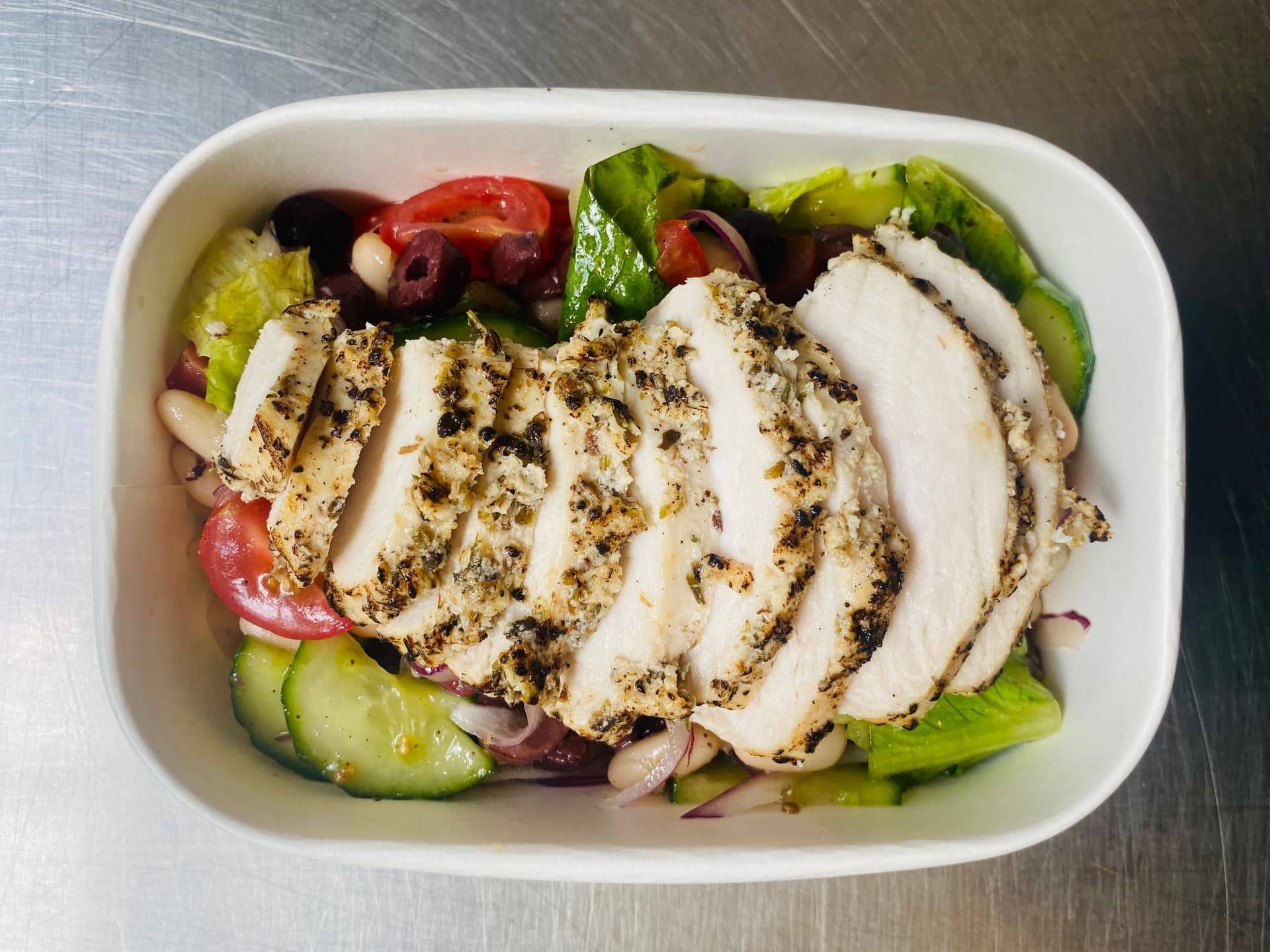 Grilled chicken breast, seasoned to perfection, sitting on a bed of crisp Mediterranean salad featuring tomato, cucumber, olives and cannellini beans. Served with a tangy lemon dressing.