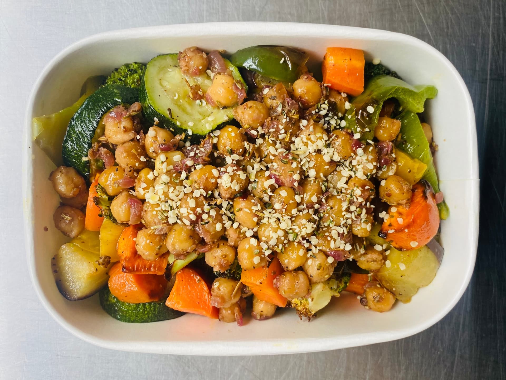 A medley of roasted seasonal vegetables topped with chickpeas and hemp seeds. Served with a balsamic dressing on the side.