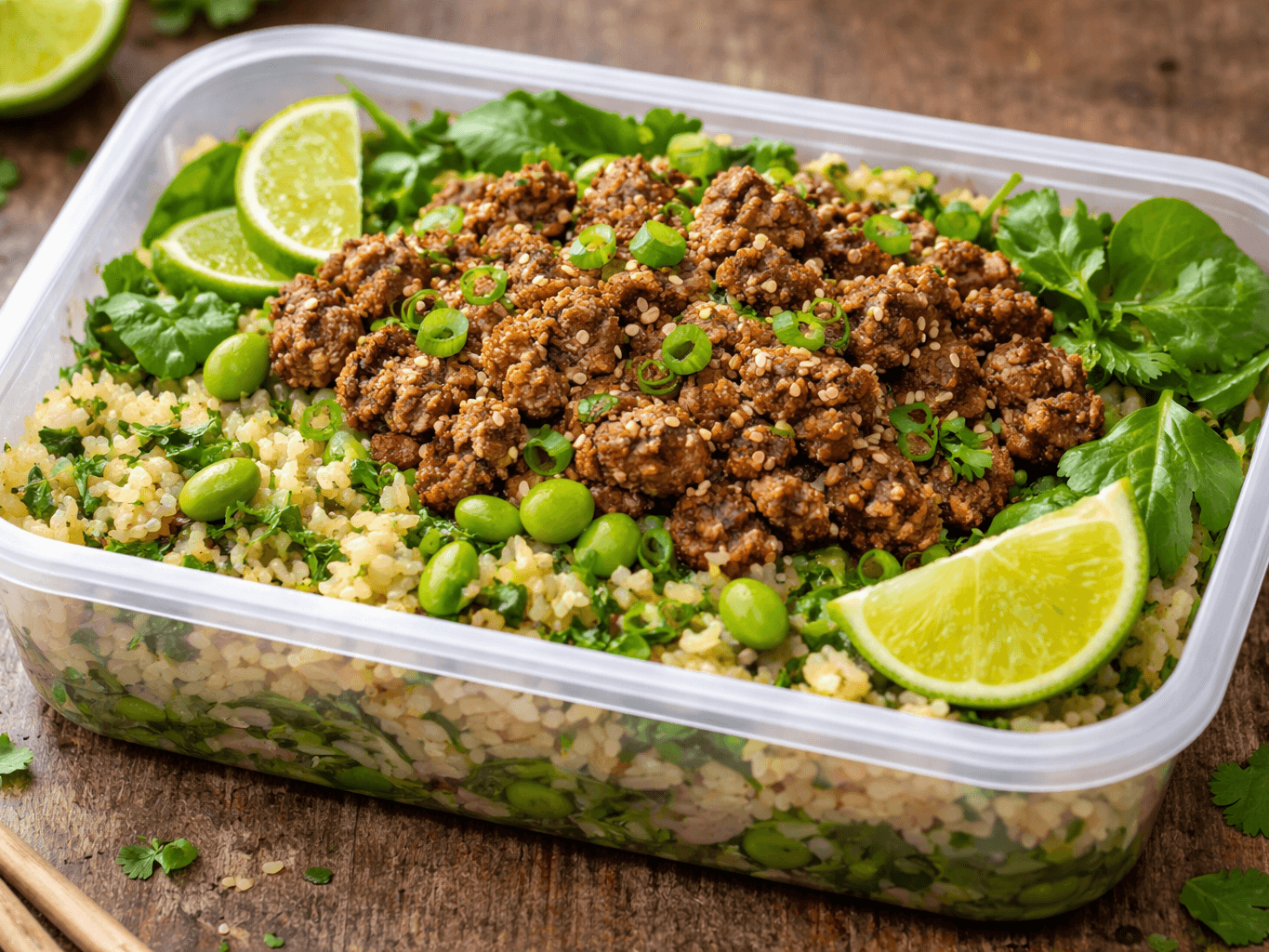 Five-spice beef with green herb rice, edamame and fresh greens, finished with a squeeze of lime. High-protein, fresh and packed with bold, punchy flavour.