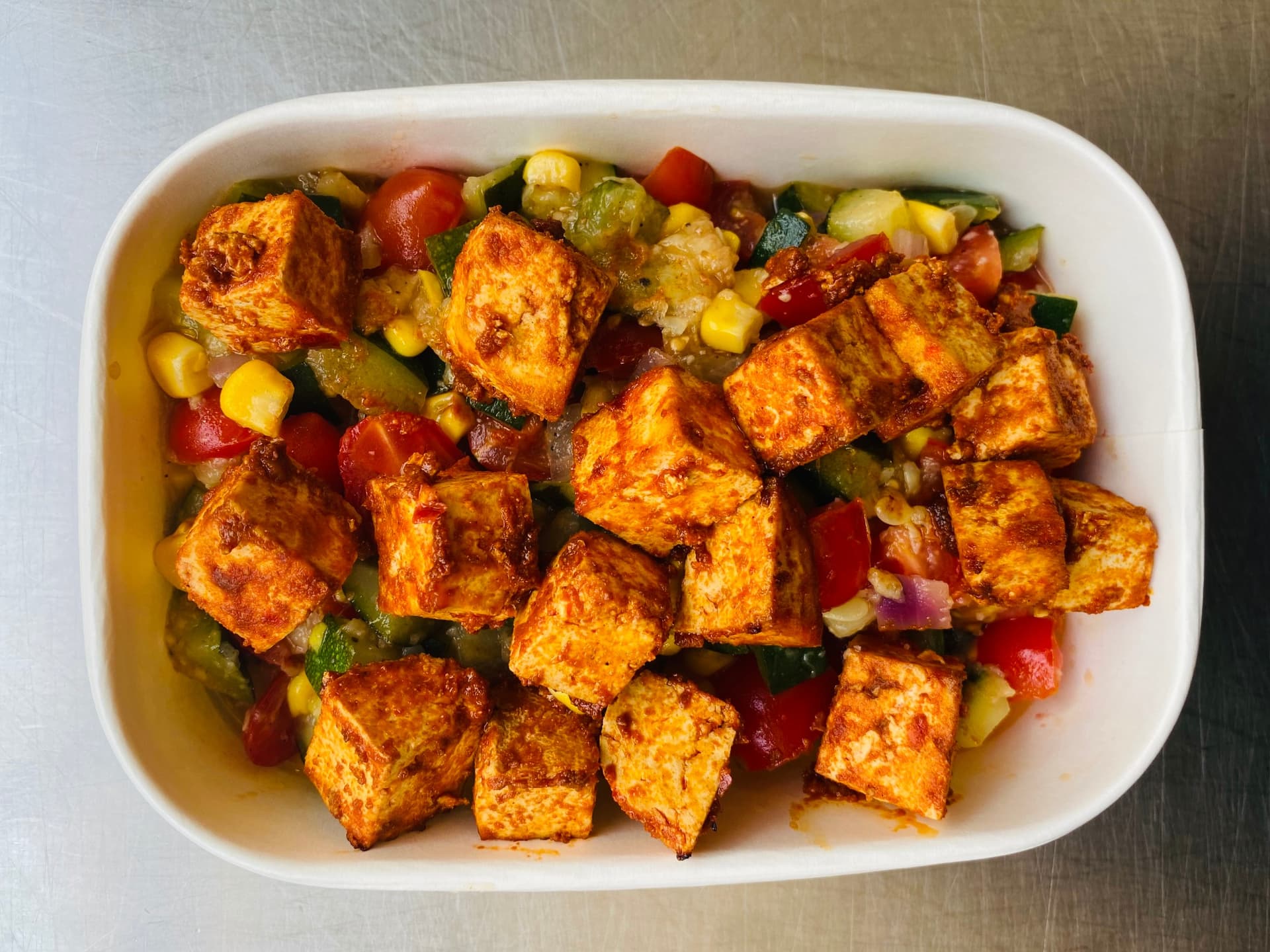 A flavoursome dish featuring crispy, spiced tofu cubes served over a vibrant mix of sautéed zucchini, corn, and tomato.