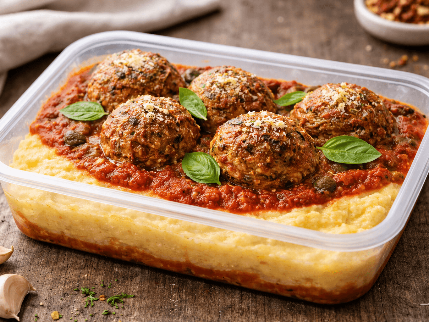 Juicy beef and pork meatballs with zucchini and ricotta, simmered in a rich tomato and basil sauce, served with creamy polenta and a sprinkle of parmesan. A comforting, high-protein dish that’s hearty, satisfying and full of flavour.