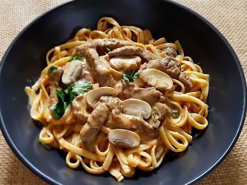 Tender strips of grass fed beef from Tasmania, sauteed in a sizzling paprika and onion sauce, tossed with succulent mushrooms & dijon mustard and finally the richness of sour cream and served with linguine. Packet size: 300g