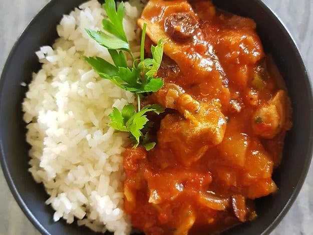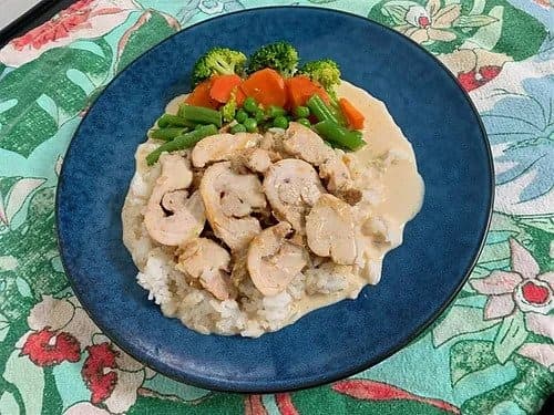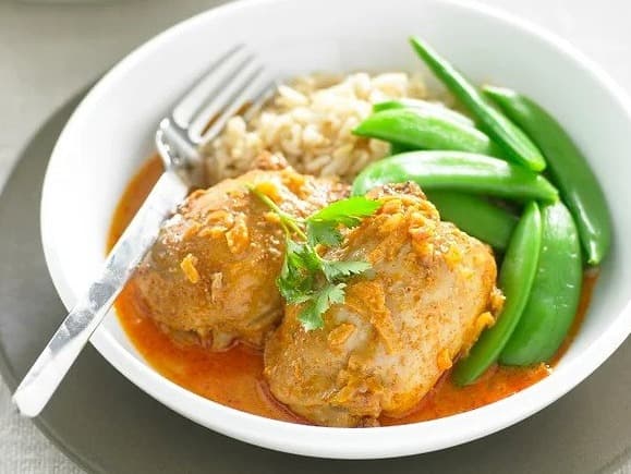 Tender chicken thighs marinated & roasted in an exotic blend of spices and poached in lemon juice & coconut cream, then thinly sliced and served with fragrant jasmine rice and vegetables. Packet size: 420g